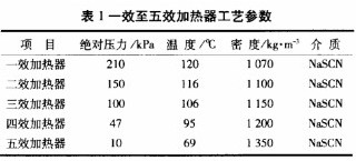 相同類型的差壓變送器,一效至四效加熱器液位變送器測量準確,而五效加熱器液位變送器液位出現異常波動,一效至五效加熱器工藝參數如表1所示。從液位變送器測量原理可以得出,與液位測量有關的工藝參數有壓力、溫度、密度及被測介質等。