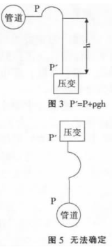 建議采用圖2的安裝方式,如不得已需要選擇圖3、圖4的安裝方式一定要對(duì)壓力進(jìn)行補(bǔ)償。不建議按照?qǐng)D5的方式安裝,因?yàn)闊o法確定P'與P的關(guān)系。