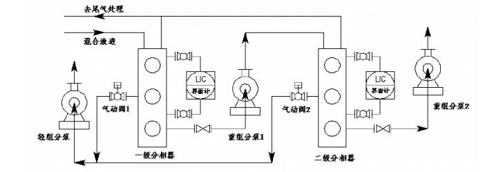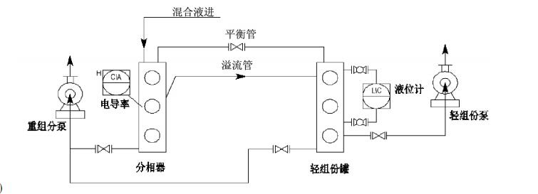 本公司對兩種互不相溶液體采用的原分液方案為,通過二次靜置分相器分相,普通磁翻板液位計進行在線液位和界位的檢測,通過液位和界位連鎖啟停上下層液體輸送泵和上下層液體輸送管道上的自動切換閥門來實現,系統原理如圖 1。