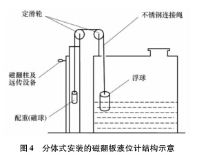 分體式磁翻板液位計的安裝步驟如下: ①通過計算浮力和配重, 在槽體頂部合適位置安裝定滑輪, 在槽外合適位子安裝磁翻板傳感裝置; ②用直徑為 3 mm 的不銹鋼繩連接浮子和配重, 鋼繩長度根據液位來計算。這里特別要注意, 磁翻板要反向安裝。